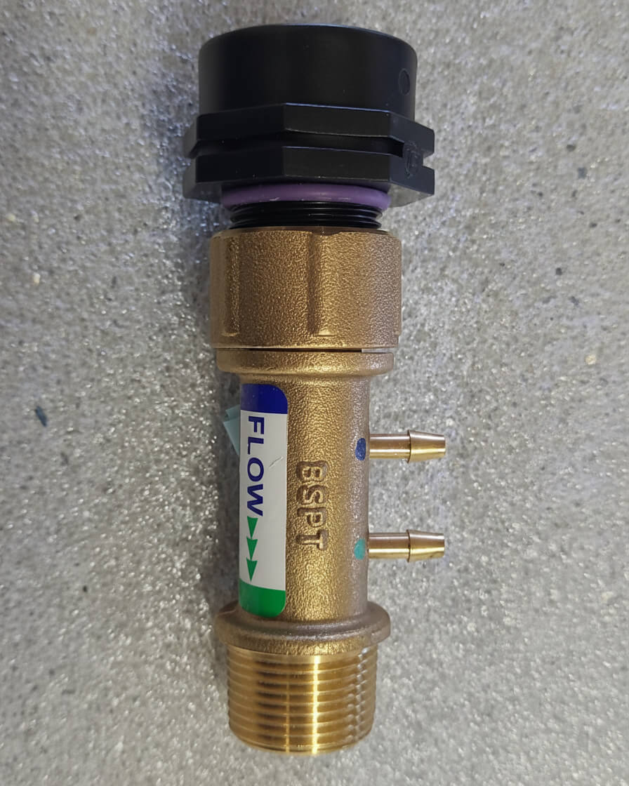 Brass hose tap connector, fitted with 20mm (3/4″ bsp) threaded adapter for tap.
